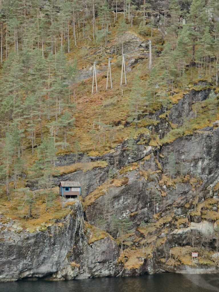 Keep an eye out for the old fishing huts (or ”giljer”. These are specialized salmon-watching huts that represent a centuries-old tradition of “sitjefiske” (sitting-fishing). Historically, fishermen would sit inside these giljer for hours, waiting for the perfect moment to manually trigger a net as a giant Atlantic salmon swam upstream.
