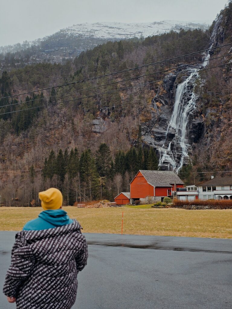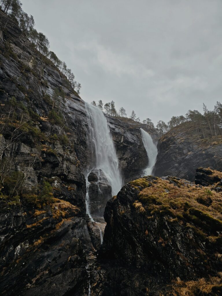 Just a short, scenic drive from the bridge, you’ll come across the beauty of Hesjedalsfossen, one of the most underrated stops in the Vaksdal region. This twin-streamed wonder falls down nearly 70 meters but what makes it truly special for a travel itinerary is that it doesn’t need any hiking – it sits directly alongside the road.