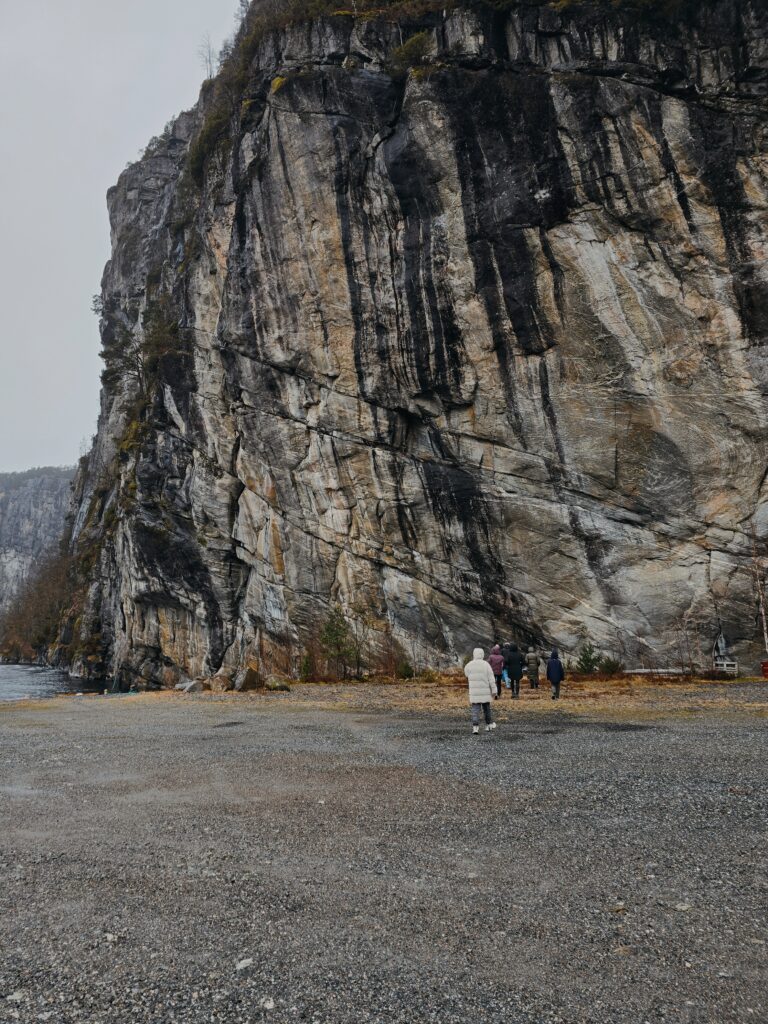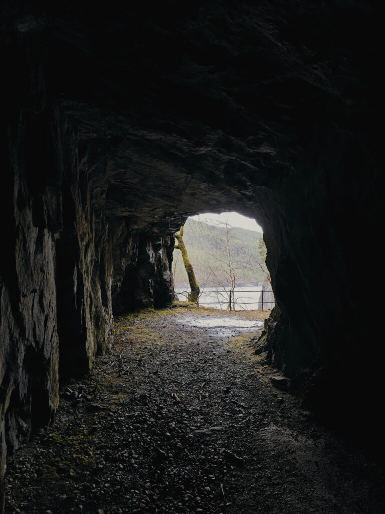 It’s found right outside a tunnel split into a road for cars and a road for pedestrians. If you follow the (very dark) pedestrian tunnel you will find an opening, offering one more view of the fjord.