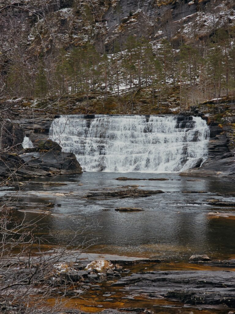A short drive from Hesjedalsfossen brings you to the more rhythmic charm of Kvernhusfossen in Mo. This waterfall is all about texture rather than height; its wide, tiered “staircase” of rushing water creates a beautiful sight at the edge of the village.