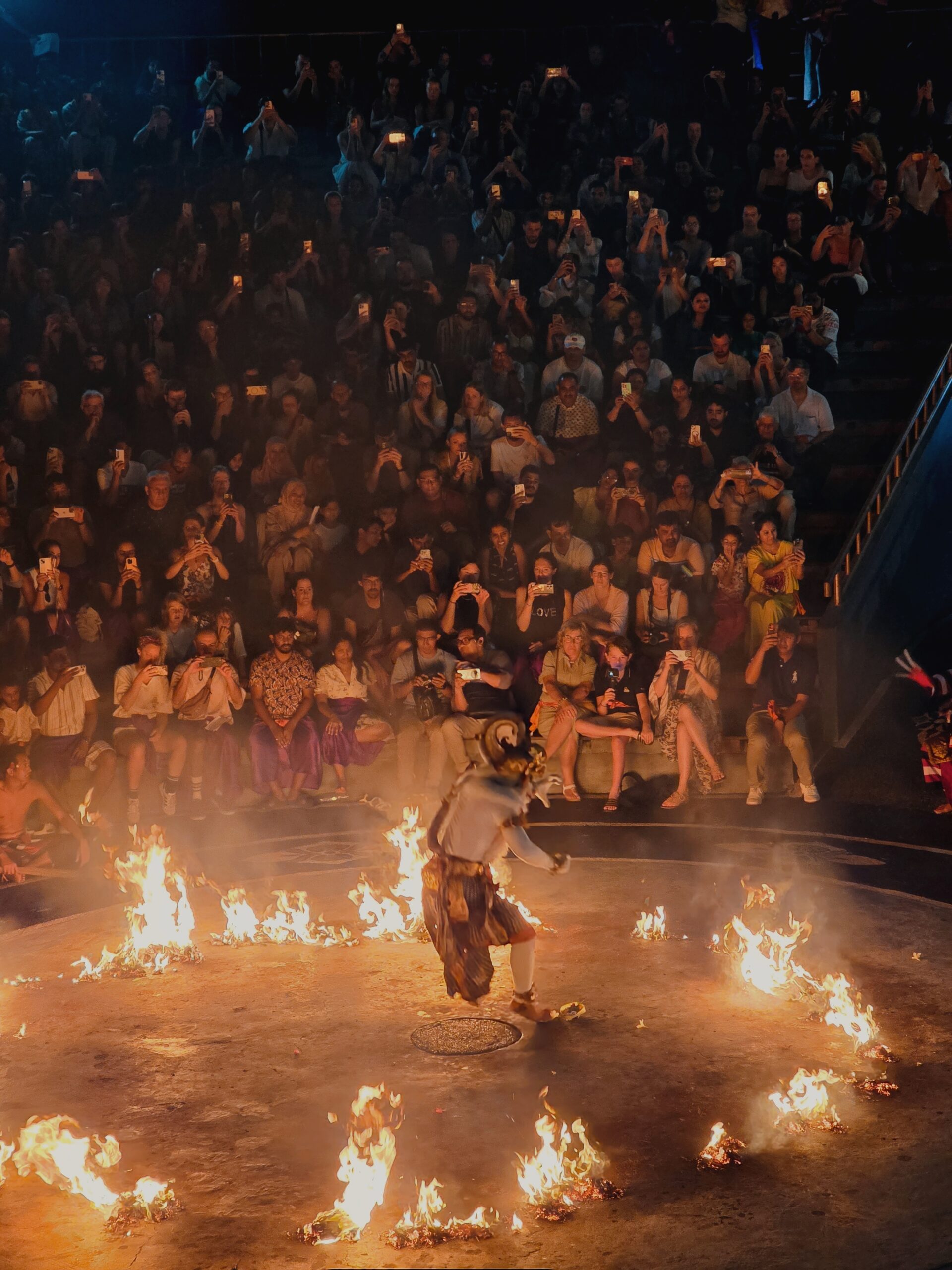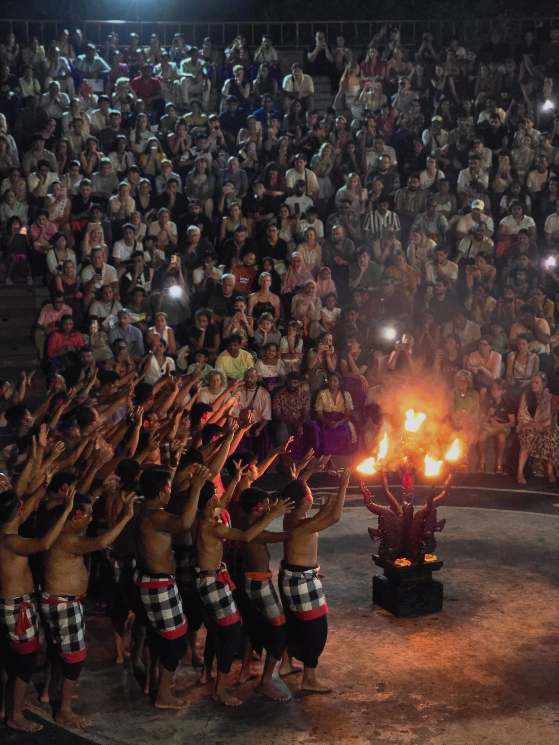 The Kecak fire dance is a captivating Balinese Hindu dance drama, primarily performed at Uluwatu Temple at sunset, that tells the story of the Ramayana epic. The dance is based on the Ramayana, a Hindu epic, and focuses on the abduction of Sita and the subsequent rescue by Rama and his allies, including the monkey god Hanuman. If you have the time, go early so you can visit the temple as well. That was our plan too, but we got stuck in traffic, arriving at the site after the temple had closed.