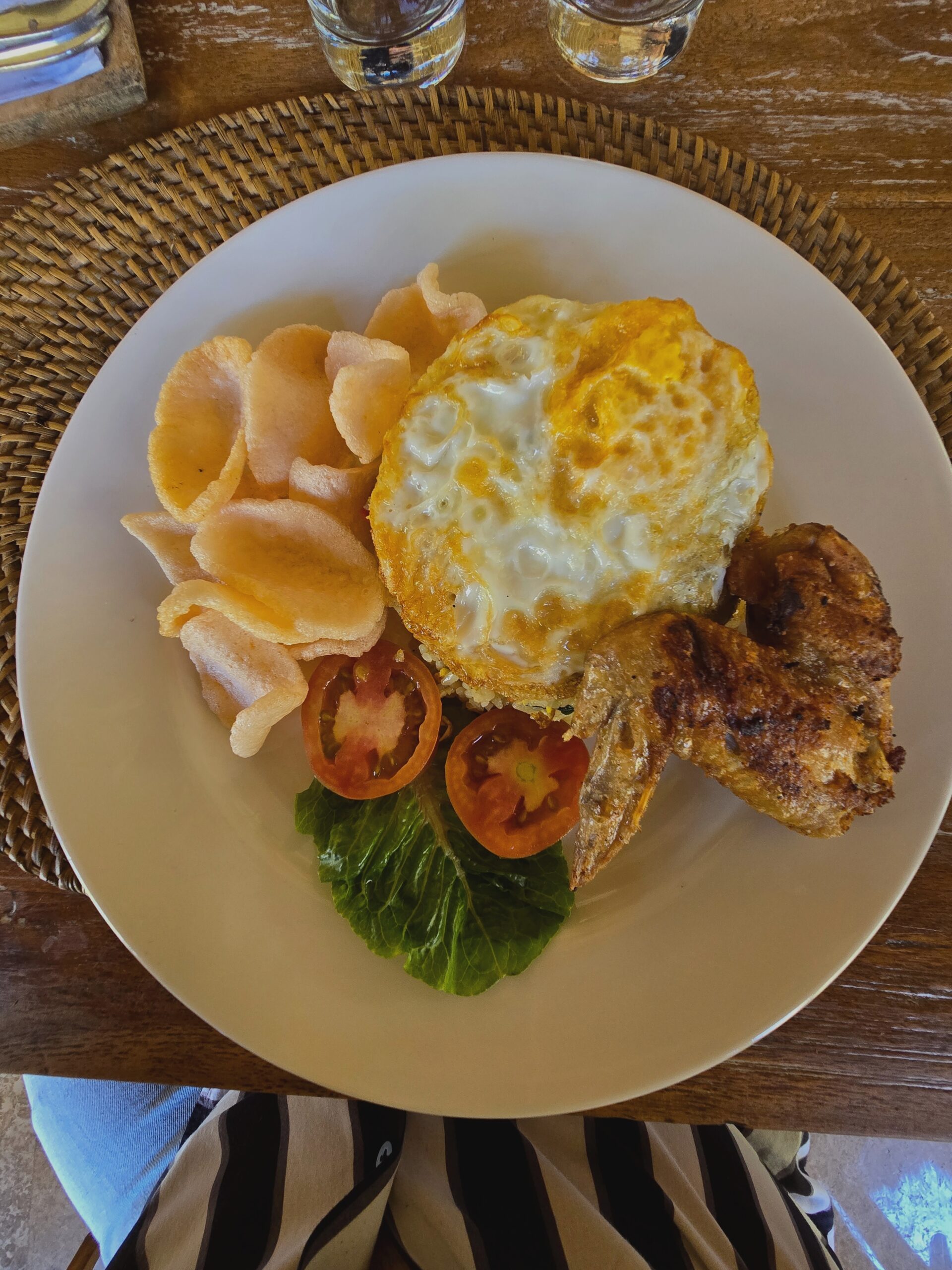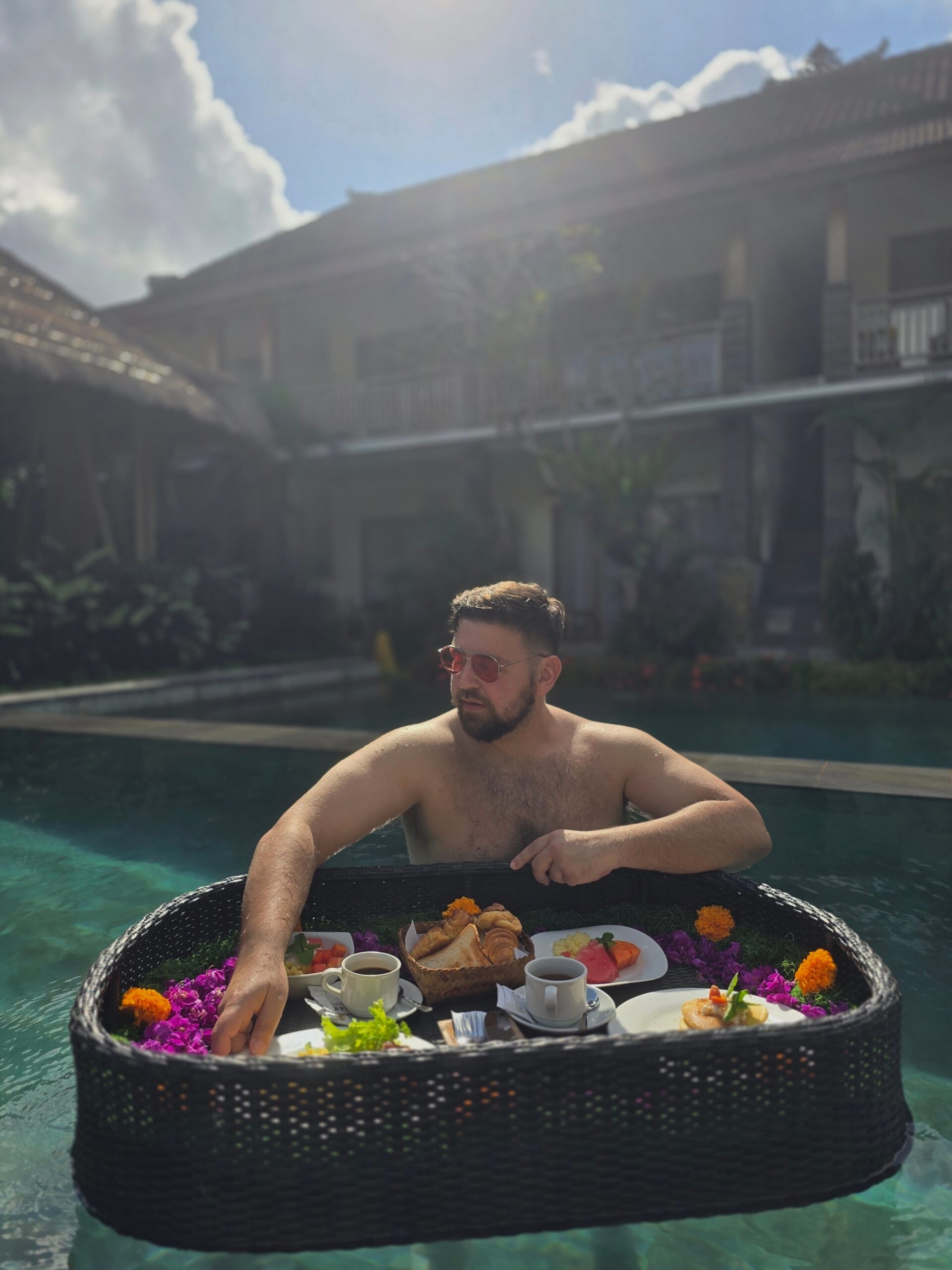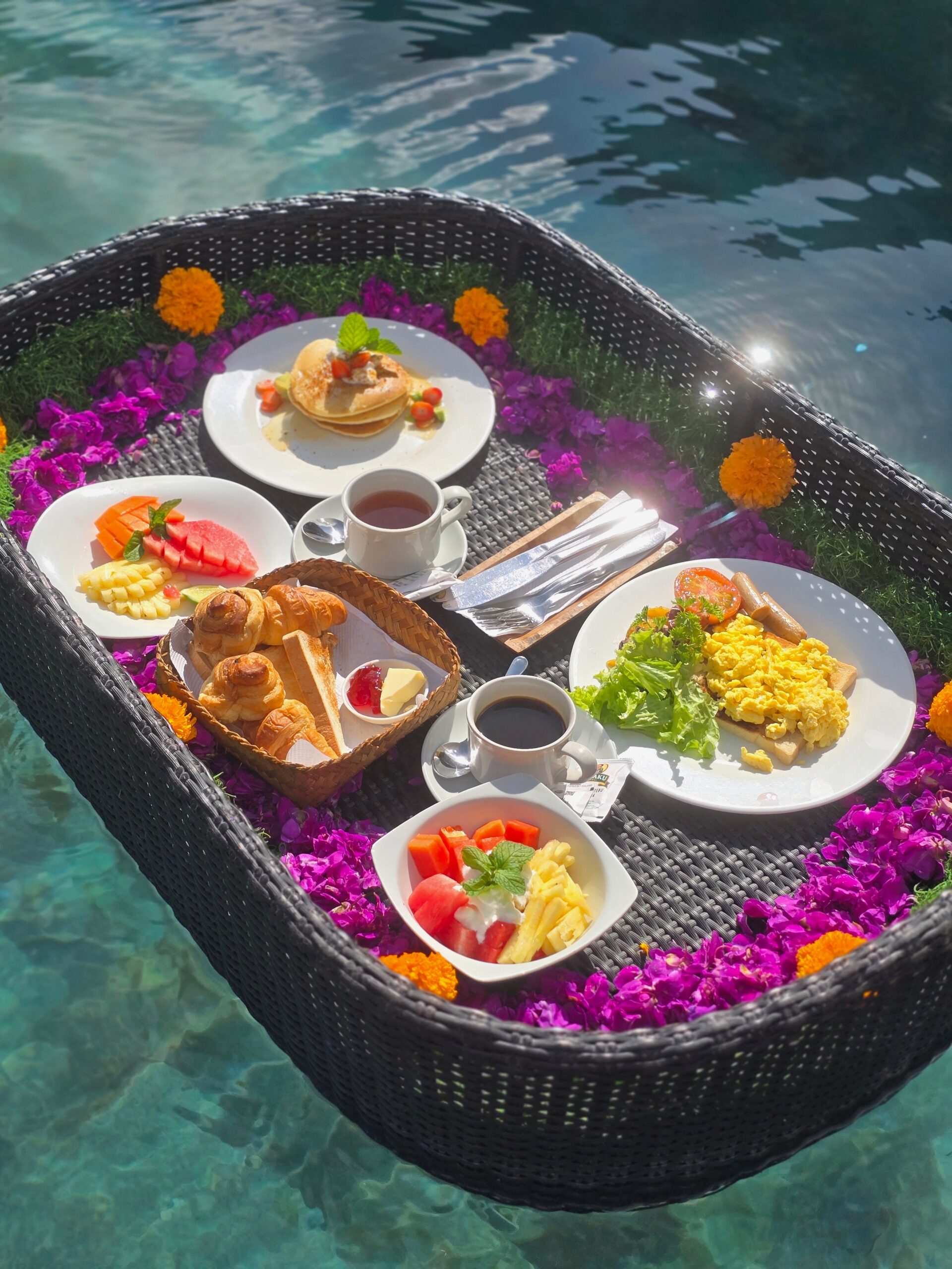 If you have seen Bali on social media, you already have seen the floating breakfast. It holds no traditional meaning, it started purely as a tourist-y thing from resorts in Bali but its fun. Basically you are served breakfast in a basket tray floating in the swimming pool and its nothing more and nothing less than that. It’s just one more fun experience. We had it on Kailash Suites for €8 or IDR 150,000 (for two people)!