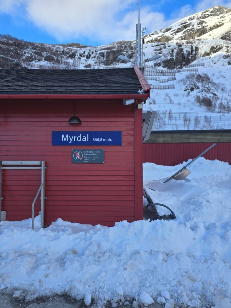 The ride ends at Myrdal Station, which sits at 864 meters above sea level. There’s no road access to this station, as it only exists to connect the Flåm Railway with the main Bergen Line (Bergensbanen).