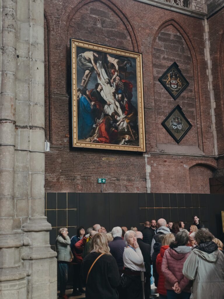 Now, back to the cathedral. The gothic architecture is breathtaking, with its high vaulted ceilings, tall stained-glass windows, and a calm, golden light that fills the space. It also includes some incredible paintings like «The Descend from the Cross» by Theodor Rombouts and the world-famous «Adoration of the Mystic Lamb» by the Van Eyck brothers.